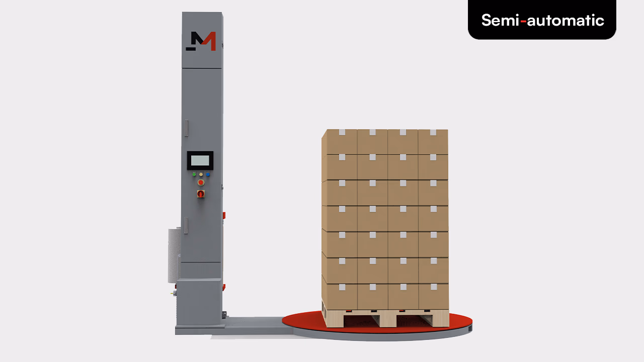 Semi-automatic pallet wrapper with full customization. Manual film fixing only — all other operations automatic.